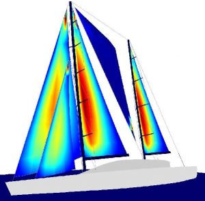 - Aeroelastic Analisys: our finite element software (FEA) calculates the deformed sail shape with wind and rig loads applied. Then CFD analysis calculates lift to drag ratio and CP position for the deformed (real) sail.