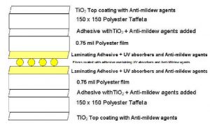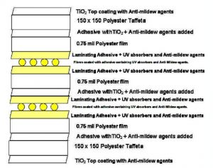 MEMBRANE taffeta components offer the highest UV resistance and ant-mildew due to the extensive use of Titanium dioxide (TiO2), anti- mildew agents and UV absorbers throughout their construction.